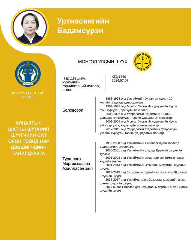 Хяналтын шатны шүүхийн шүүгчийн сул орон тоонд бүртгэсэн 12 нэр дэвшигчийн танилцуулгыг хүргэж байна. Нэр дэвшигчээс асуух асуулт, саналыг 14 хоногийн хугацаанд [email protected] цахим хаягаар хүлээн авна.